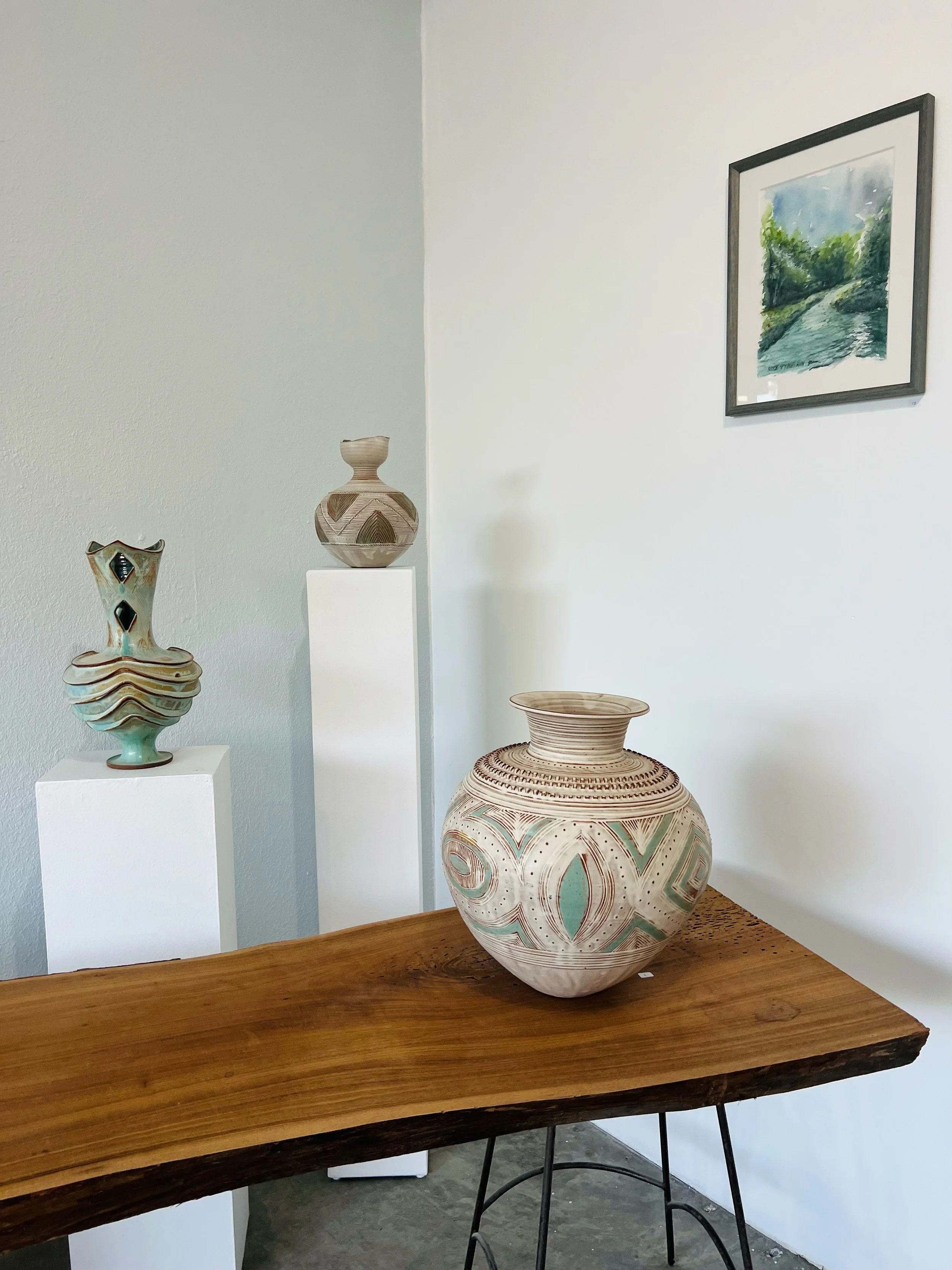 Osa’s work complemented this spirit of discovery and record through three distinct bodies of work. Her recognized and established line of stoneware vessels channel a relationship and deep connection to water and have been her primary studio output for years. Since her time settling in Sarasota, Atoe has broadened and adapted her practice, studying traditional methods of pottery making and diving into the world of wild clay, early ceramic practices and the geologic and cultural origins of handmade ceramic wares.